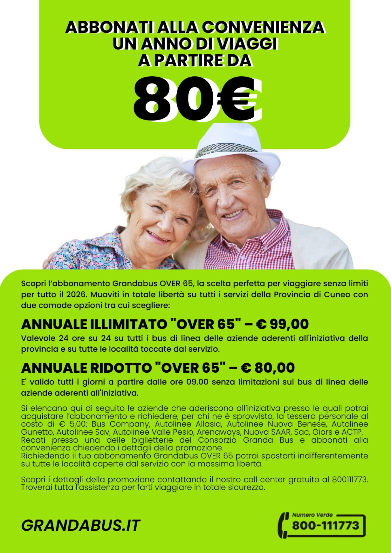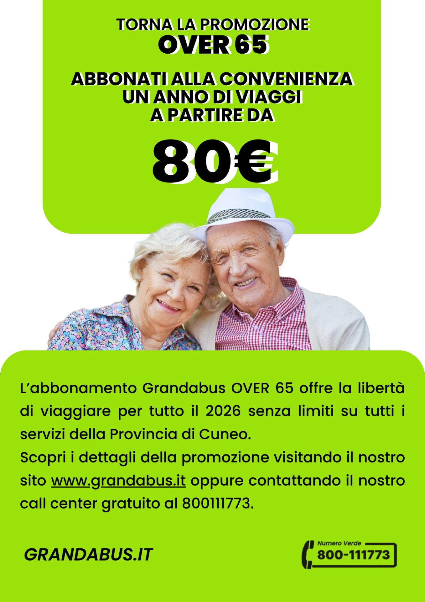 Con l’abbonamento Grandabus Over 65 è possibile viaggiare per tutto il 2026 senza limiti su tutti i servizi della Provincia di Cuneo a partire da 80,00€.